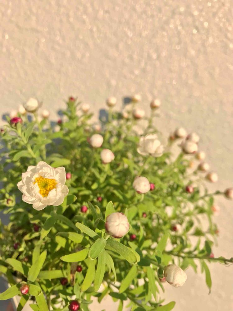 ピンク色の小さな蕾、ふっくら白い開花前の姿、黄色が顔をのぞかせて風に揺れる優しい花、枯れてもまだキレイ✨