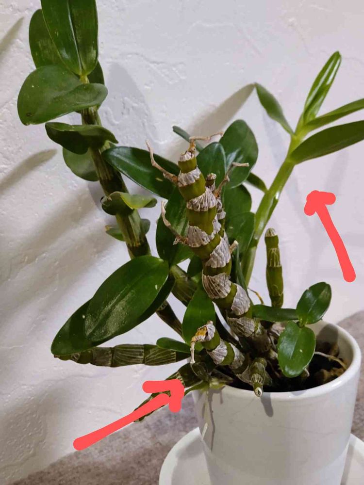 トイレの窓辺に移動して様子見してたデンドロ。右上の←バルブ、成長してました😅左下の←には根っこがでてきて高芽発生⁉️位置的には高くなくむしろ低い、低芽💦