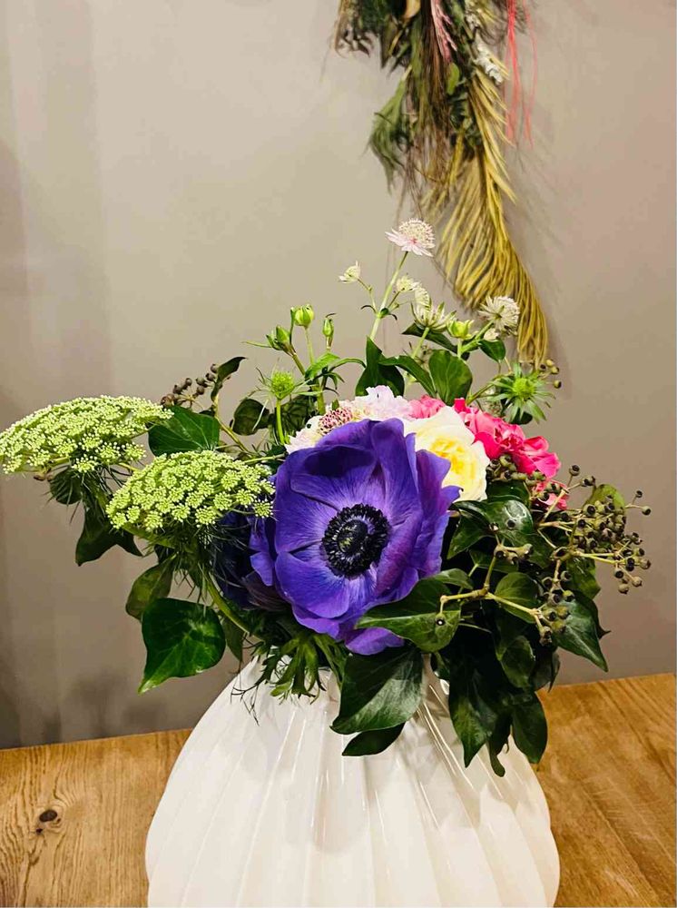 今回は、紫とブルーのお花を希望され紫のアネモネをメインにプレゼントしました♡