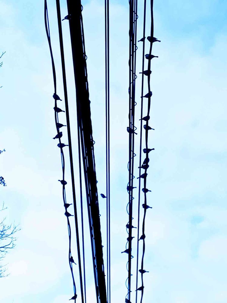 買い物帰りに、頭の上が騒がしく、見上げると雀がズラリ並んでいました。