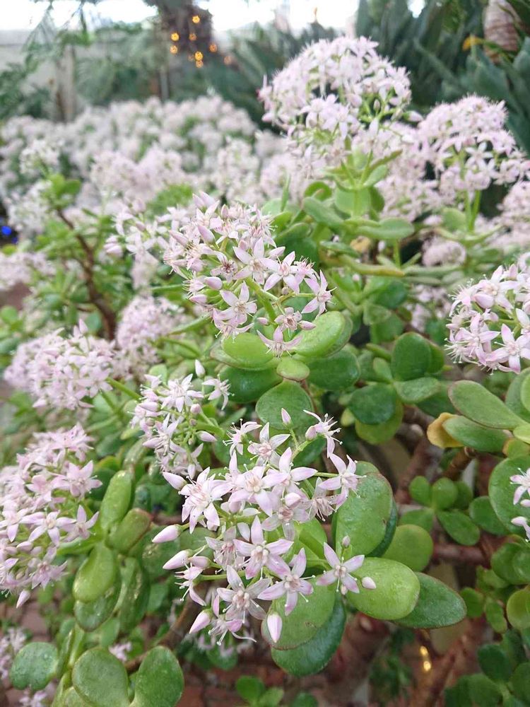1m位の高さでズラ〜〜〜と並んだ金のなる木の鉢植え🤩