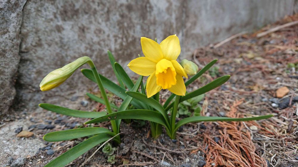 かわいいミニスイセン。今日はちらちらと雪模様です。寒いけど頑張って。