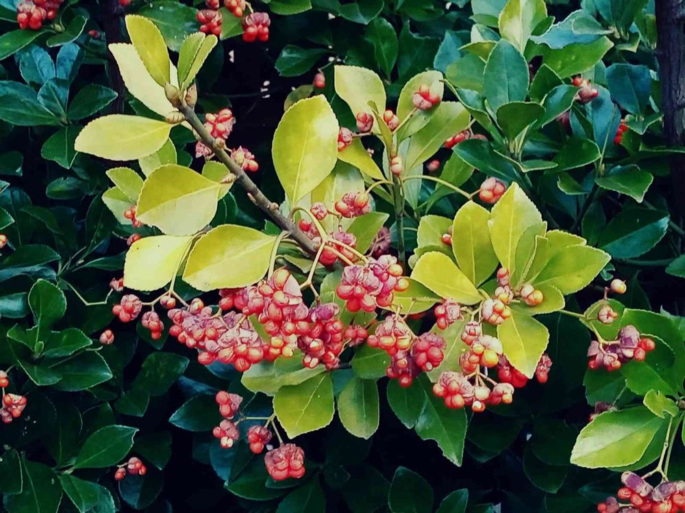 散策中に、ご近所のお庭に、柾の赤い実が沢山付いていました。
