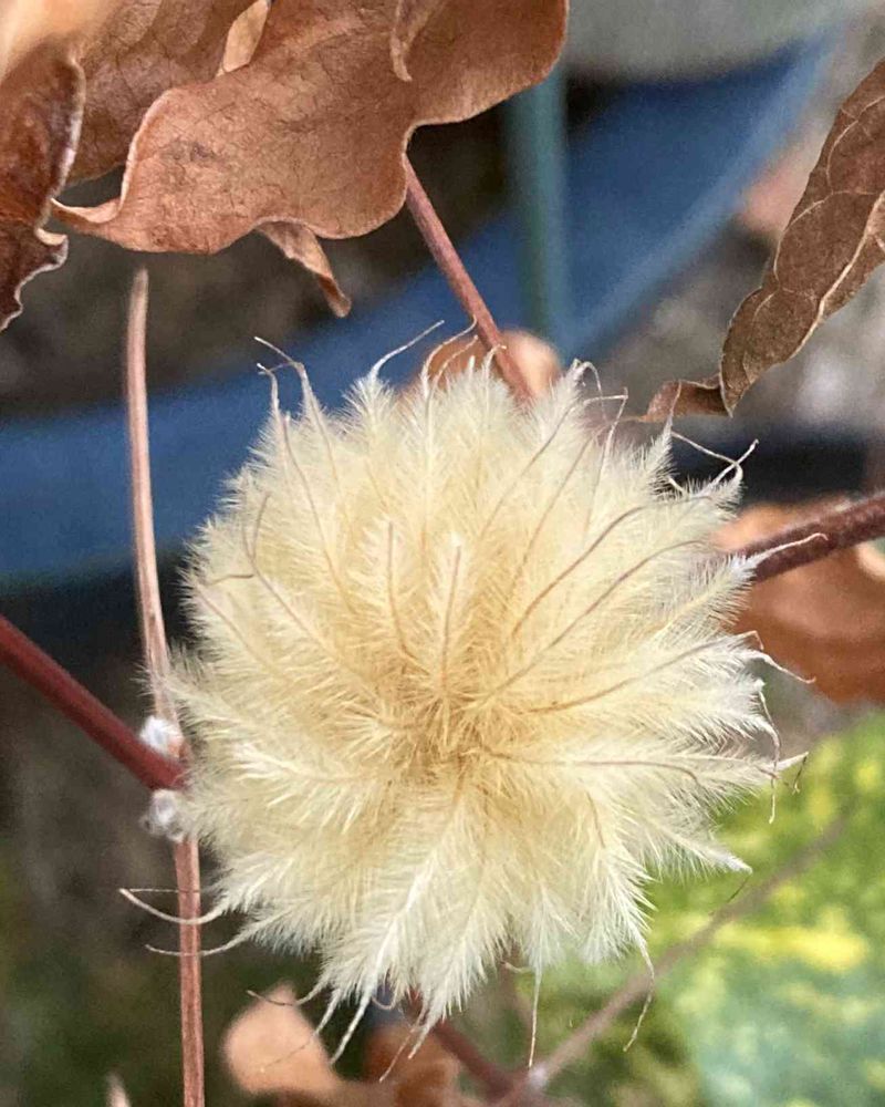 今朝のクレマチスの枯れた葉と綿毛