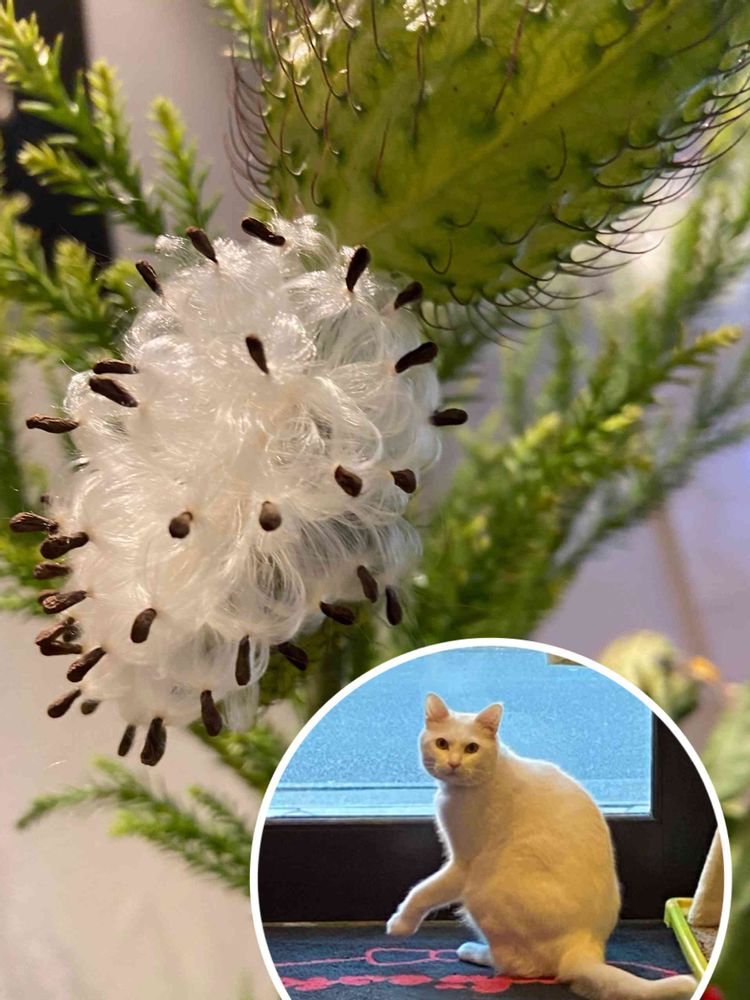 可愛い猫ちゃんと、素敵な綿毛付きの種ですね。😻🎶