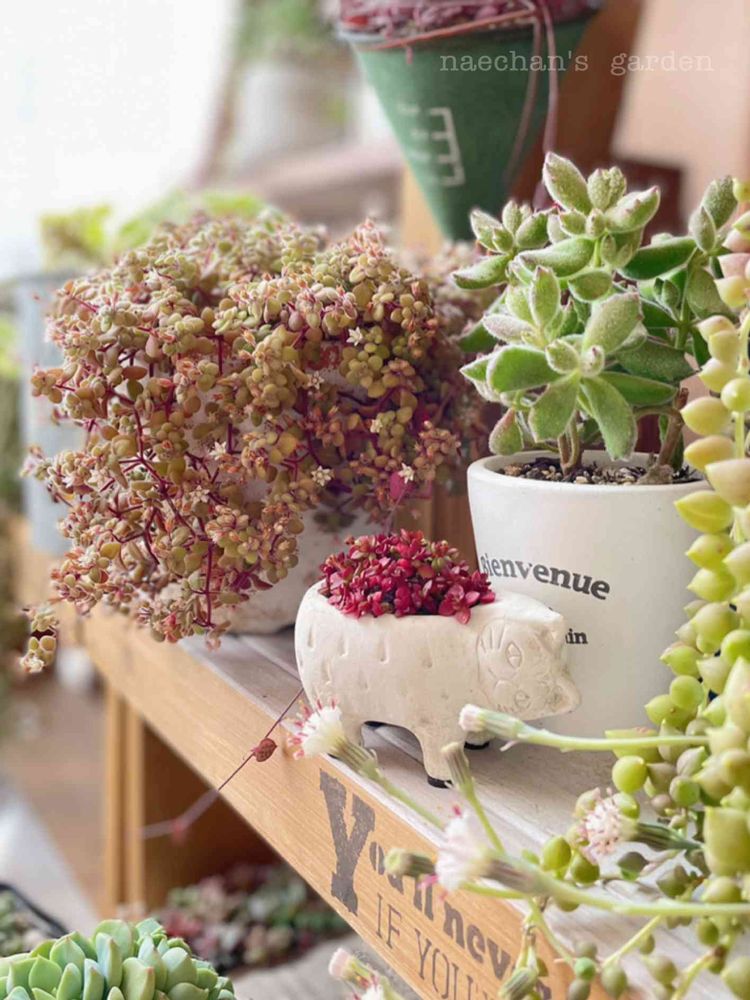 ネコ鉢の紅稚児さん、赤くなって花芽もいっぱい出てきたんだよ🎶¨̮ネコの背中にお花が咲いたら(≧з≦)プププ