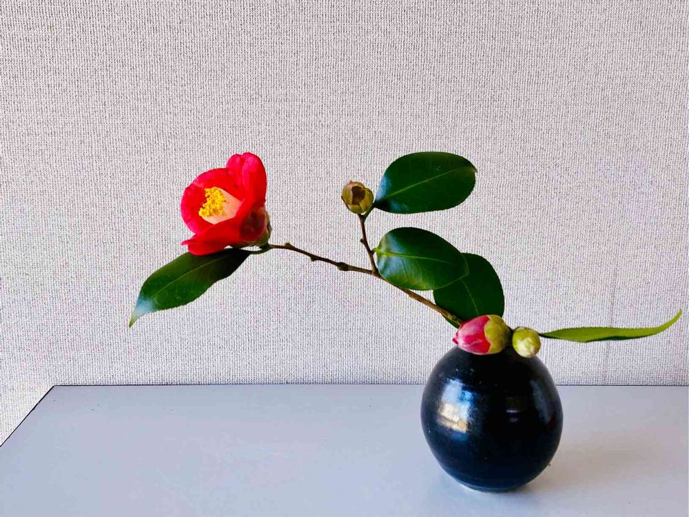 ツバキさんにはやっぱり椿ですね。(=´∀`) 黒い花瓶がとっても似合います♡