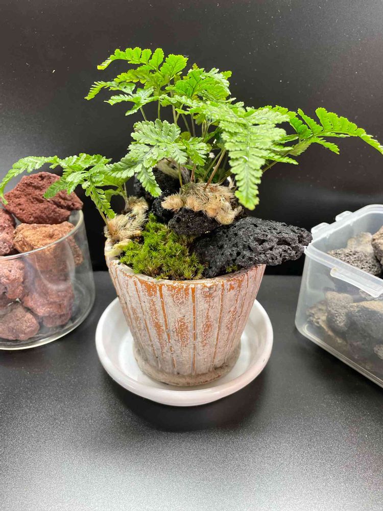 トキワシノブさん導入。石化なんで結構ネコってます^_^。着生系なんで溶岩石に乗せて隙間に苔配置してみました。吊りシノブもやってみたい。