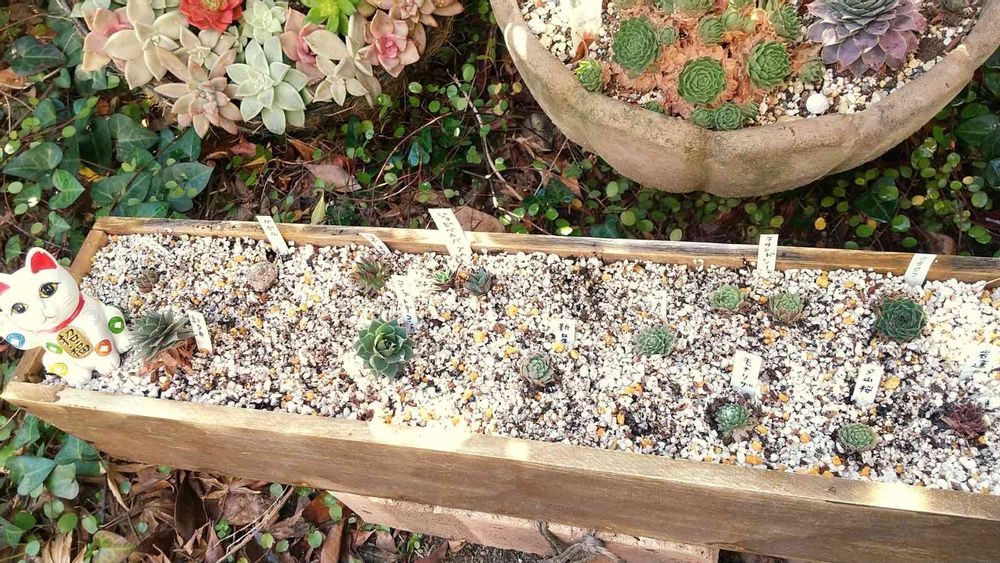 みちゃさんの真似をして、以前作った木箱に小さいセンペルたちを植え替えました😊