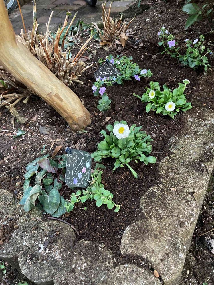 あじさいのねもとに、デージー🌼と、薔薇咲きスノーピア🌹植えました。