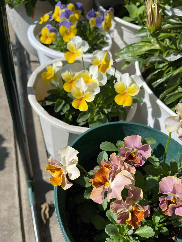 今日は朝は冷え冷えだったけど昼間はポカポカに☀️暖かい日差しを受けて綺麗に咲いている挿し芽っ子ビオラ3種類☺️