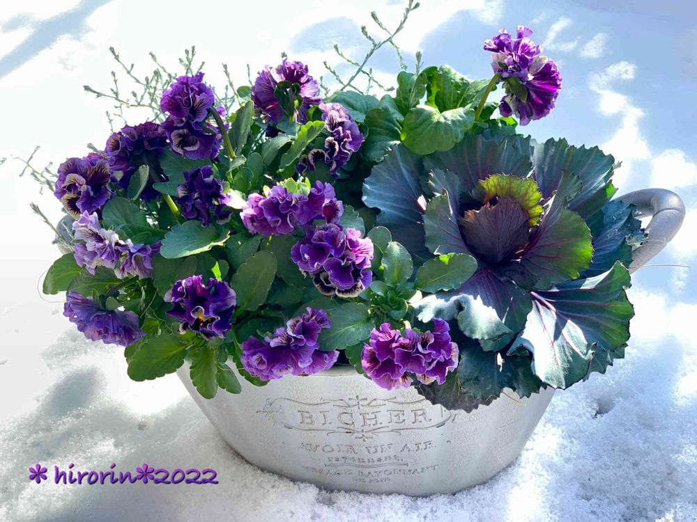 以前投稿のパンジードラキュラ、花数が増えました💜🖤葉牡丹は日当たりが良かったから色が明るくなった感じです。先日、庭に雪が積もったので記念に🤳✨