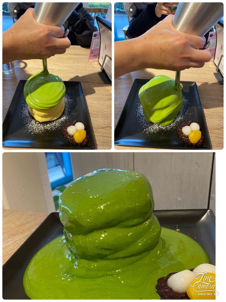 パンケーキの上にタップリの抹茶のクリームをかけてくれました。