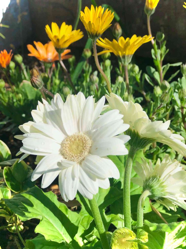 空っぽの花壇に植えたガーベラとディモルフォセカ🟡🟠ここだけ春が来たみたいに明るくなりました🤗🌼🌼🌼