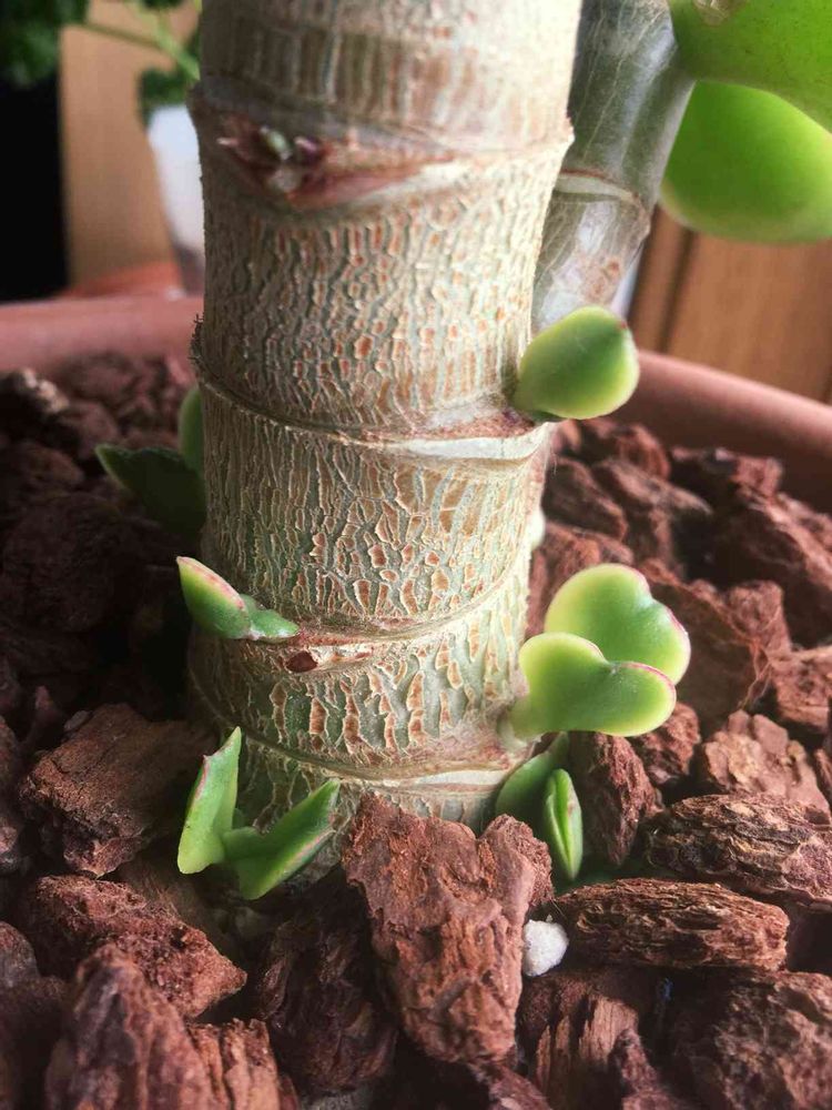 窓辺の、名前を忘れた多肉ちゃん(金の成る木っぽい)からわき芽?が、にょきにょき〜(*´∇`*)