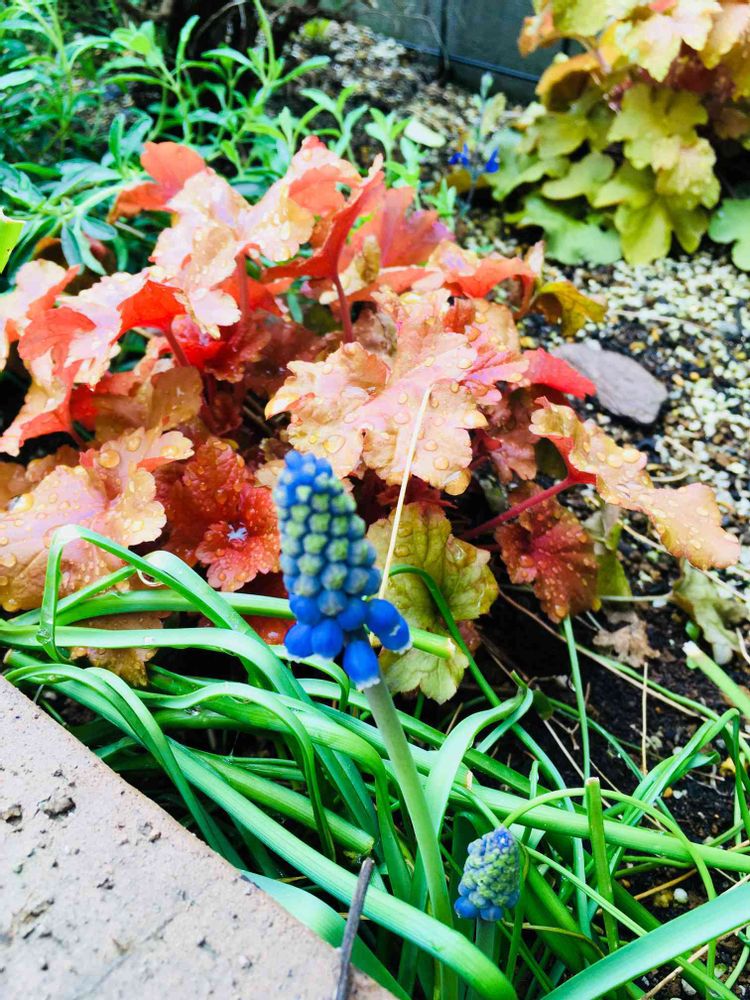 花壇のムスカリとヒューケラのコラボが毎年楽しみ!