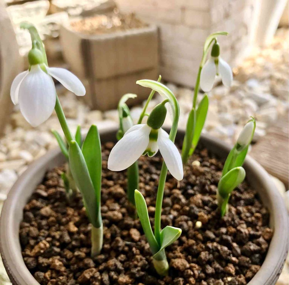 先日お迎えした芽出し球根のスノードロップですが、あっという間に開花しました✨