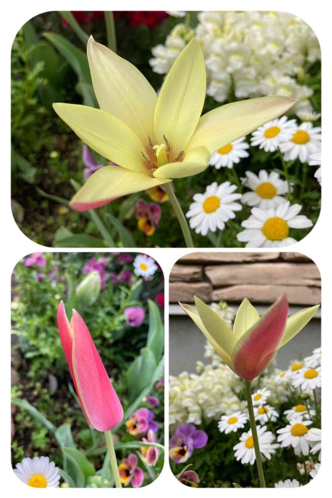 たくさんのお花に囲まれたチューリップ🌷今年も楽しみですね〜🎶🎶