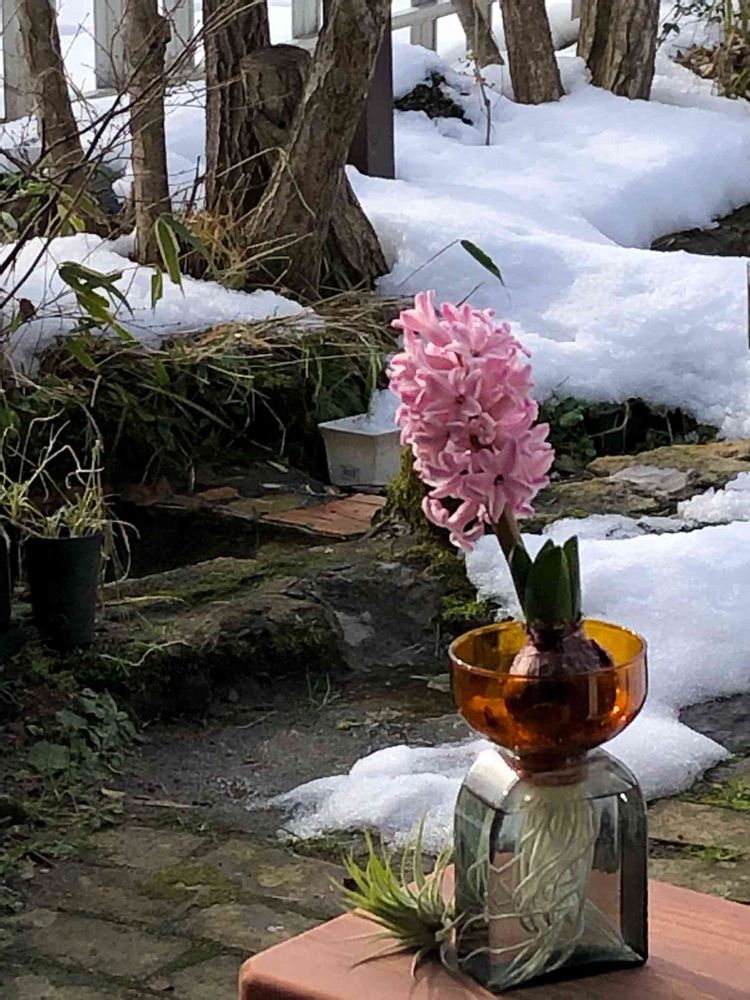 春を待つお庭をバックにして、ちょっと先取りしているヒヤシンスは誇らしげ🤗