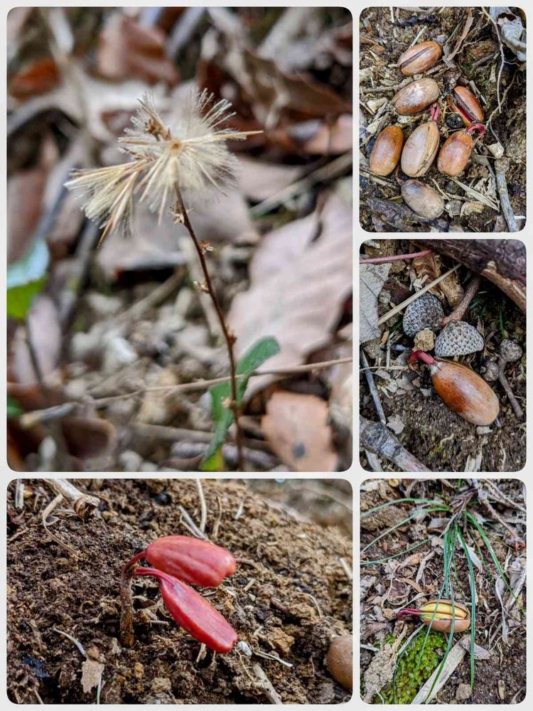 キッコウハグマの近くにドングリがたくさん落ちていて根っこが出ています。