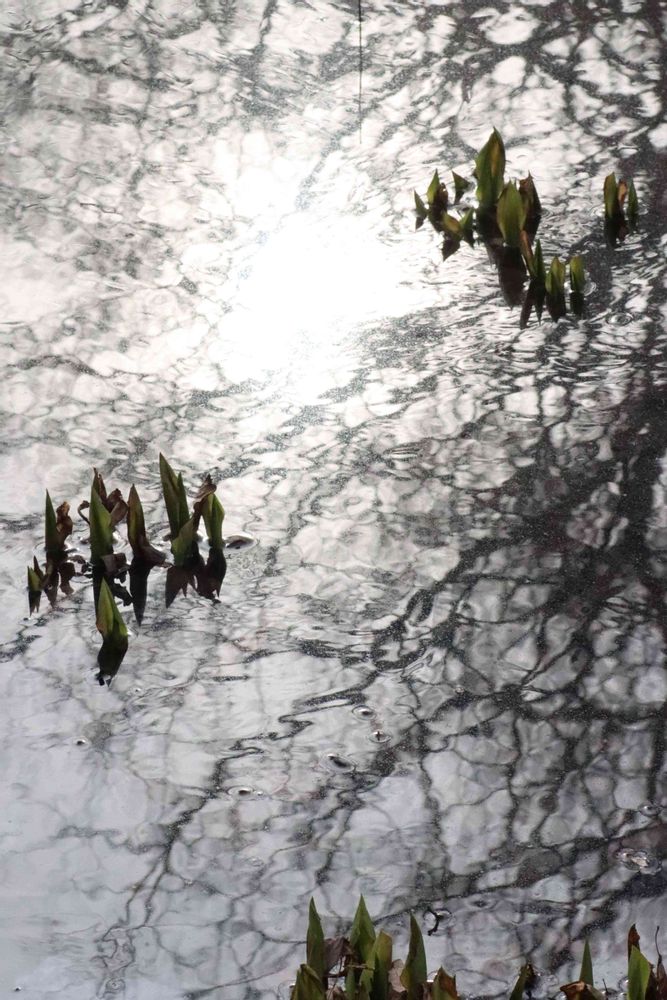 池の上に広がる枝が映る水面に、トンガリ帽子のような芽が顔を出しています