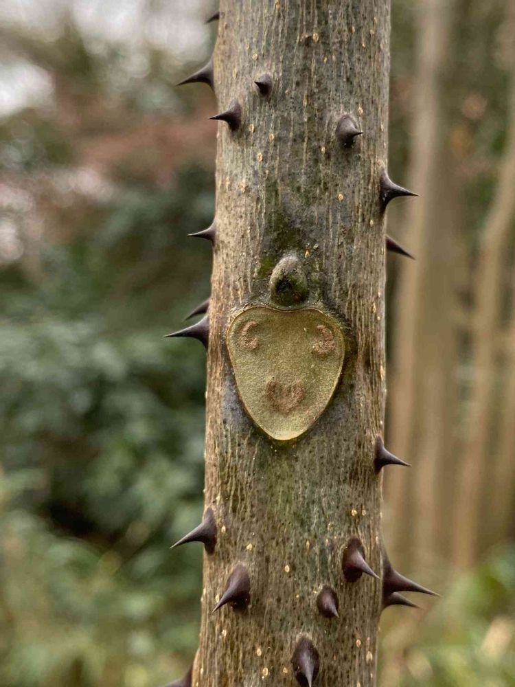 その先へ歩いて行くと〝森の小径〟かな〝武蔵野コース〟かな?で、木を見つけました。トゲがすごいですが、葉痕はなんか可愛らしいです🥰