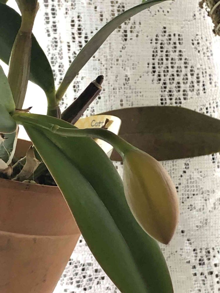 カトレアの蕾は膨らむにつれ重くなってうつむいて来ますネ😅