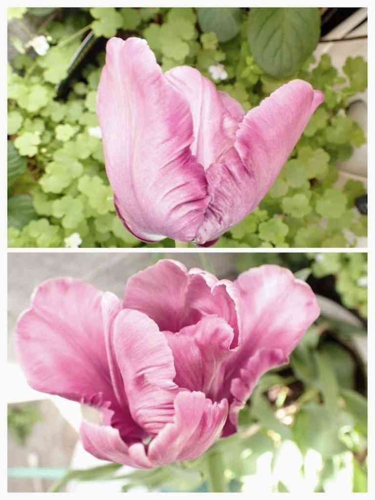 前出の、ブルーパーロットです💙😍💜写真ではピンクにしか見えませんが、実際はもう少しブルーっぽい色彩です🎶まあ、ほんとに青かといわれると、微妙かもしれませんが、チューリップの中ではかなり青に近い品種ですね😊