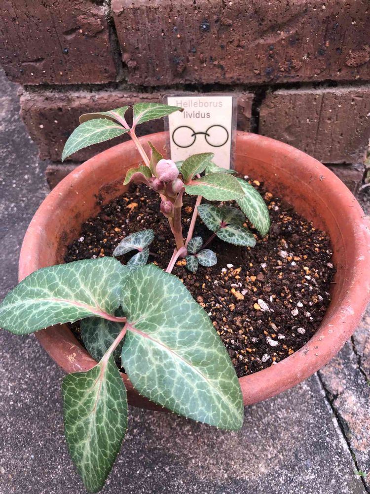 『灰色がかったグリーンからピンクの花で、形良いカップ咲き。茎も灰紫で原種らしい素朴で趣ある美しい姿。20〜30cmほどになる木立ち性種。(茎がある)紫がかった葉に銀色の網目模様が入り草姿も美しい。』 との事