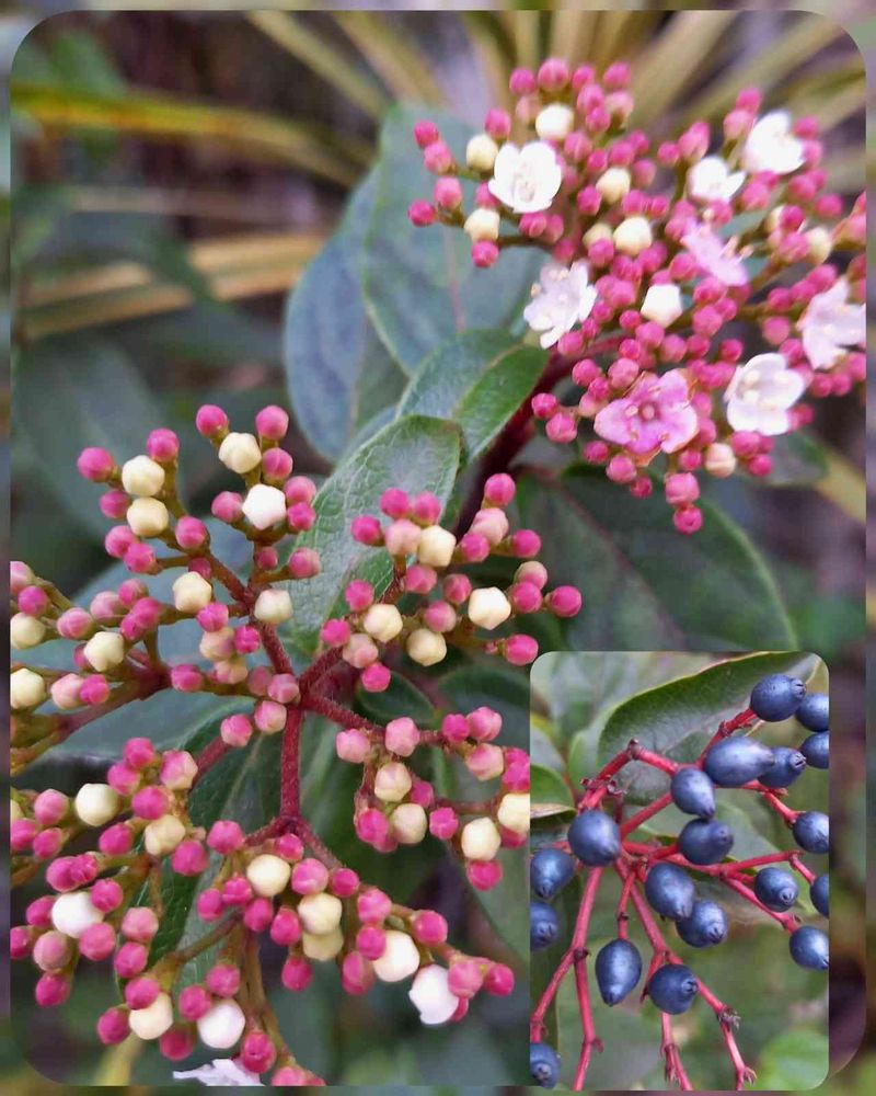 昨年11/27投稿の常盤ガマズミ(ビバーナム)のその後…今も同じ木につぼみと花が咲き、青い実もついてます💜💜💙💙
