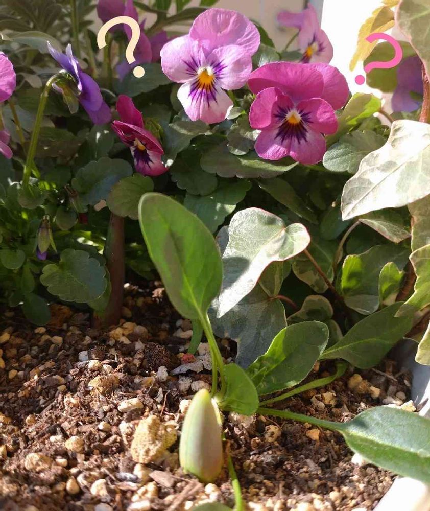 寄せ植えからほうれん草が出てきて、ビオラたちが成長を見守っています。