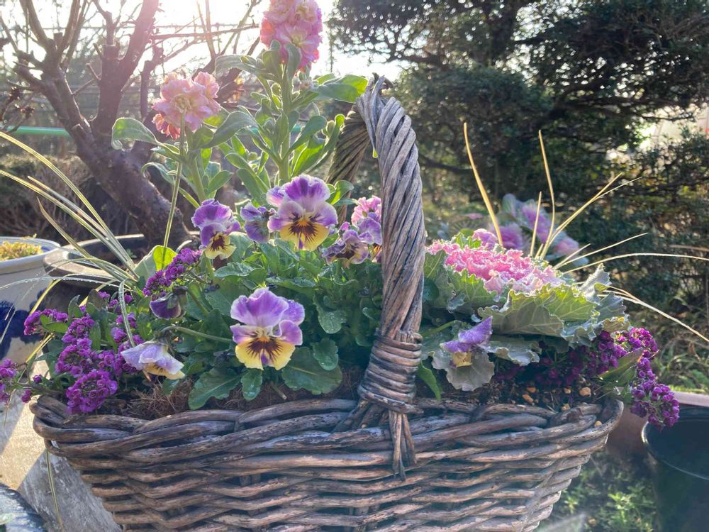 バスケットの寄せ植え、可愛いですねぇ🎵😳🎶