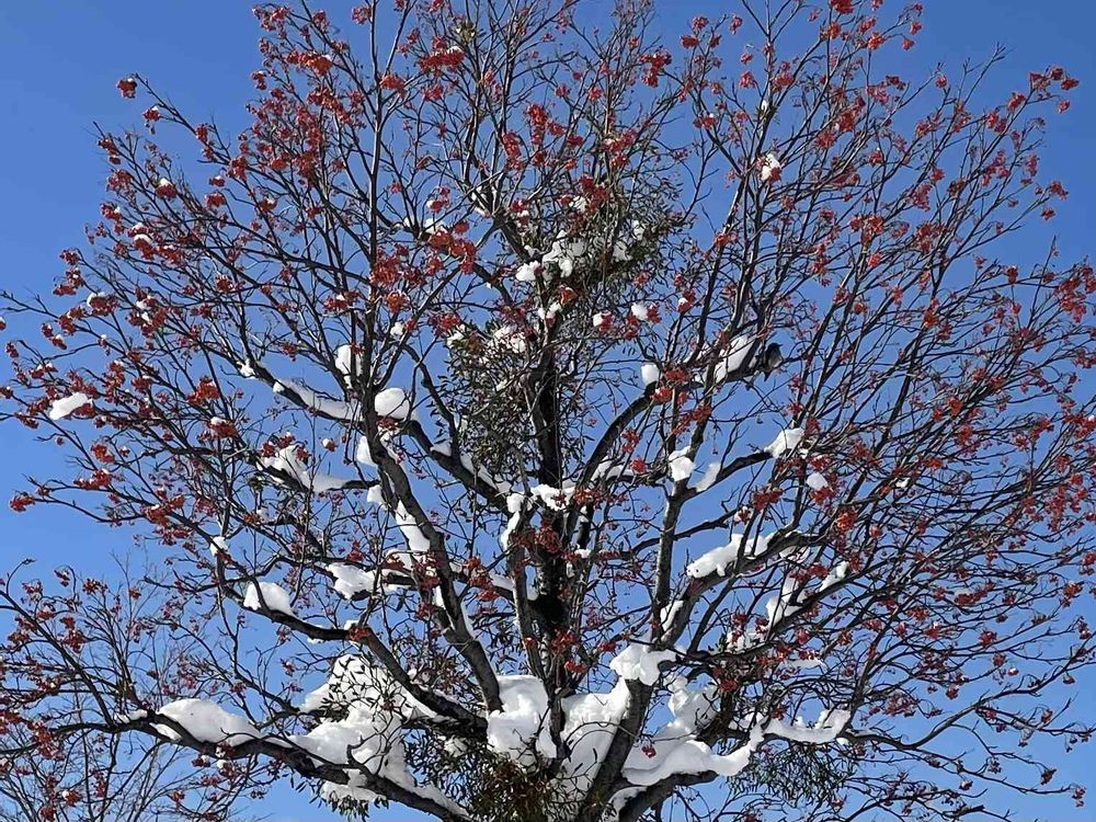 青空に映えます❣️ナナカマドに雪にヤドリギにヒヨドリ 🥰