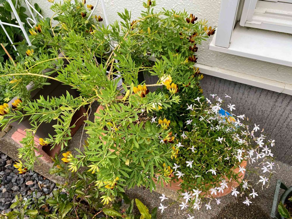 ホワイト×裏がイエローのオステオスペルマムと夏越しのスカビオサ(松虫草)も葉が出てきてるけど、ロベリアとロータスに埋もれてちっとも見えません。オステオスペルマムは黄色くひとつ咲いてるのわかるかな〜。