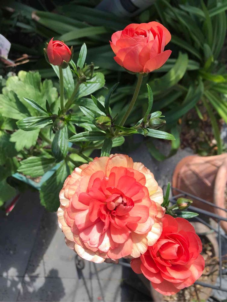 今年お迎えしたラナンキュラスラックスのエリスさん、咲き揃ってきました🌺明るいオレンジが華やかです🧡昨年のサティロス、一昨年のアリアドネは順調に葉っぱが増えてきましたが、まだまだ花芽は見当たりません。咲くのはかなり先のようです😊