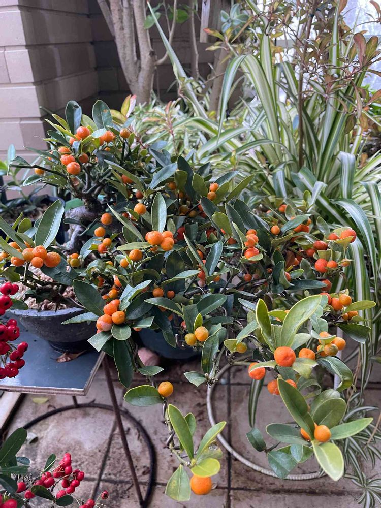 25年くらい前に東京駅の大丸で作風展があった時にこの盆栽を見つけ、珍しく私が買いました。仮温室に入れたので野鳥の心配がなく可愛いオレンジ色❤️の実をたわわにつけています。