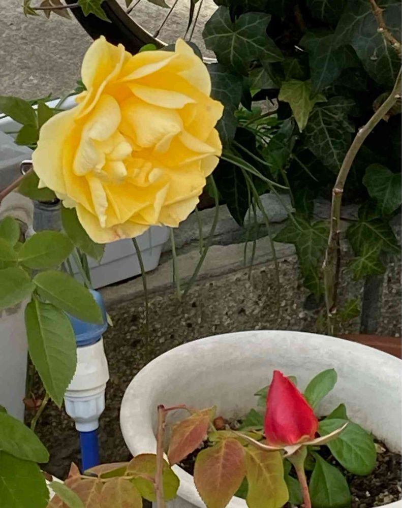 黄色いバラが赤いつぼみのバラにお話しているみたいだなぁ.