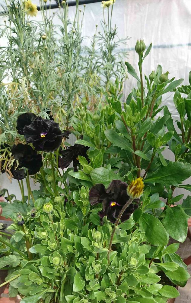 簡易ビニール温室の中のビオラさんと 同居してるオステオさんも もうすぐ咲きそうです🤗💕