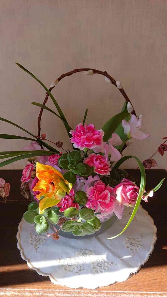 母の通っているデイサービスは、月に一度はフラワーアレンジメントのような事をしてお花を持たせてくれるのです😉