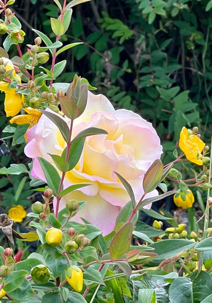 伸び伸びとした薔薇🌹タイリンキンシバイにも負けず❓いや守られながら❓