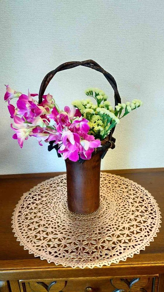 いろいろ花器を合わせてみたところこの花器が意外にもよく合いました!この器は手がついているためお花がなかなかいけにくいのですが今回は横に流れがあるためか持ち手にぶつからずいい感じ〜👍💕和風テイストな雰囲気になりましたあ✌️😆✌️