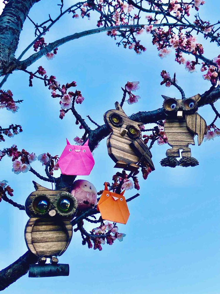 寒桜に集まっている🦉ちゃん何羽いるでしょうか?
