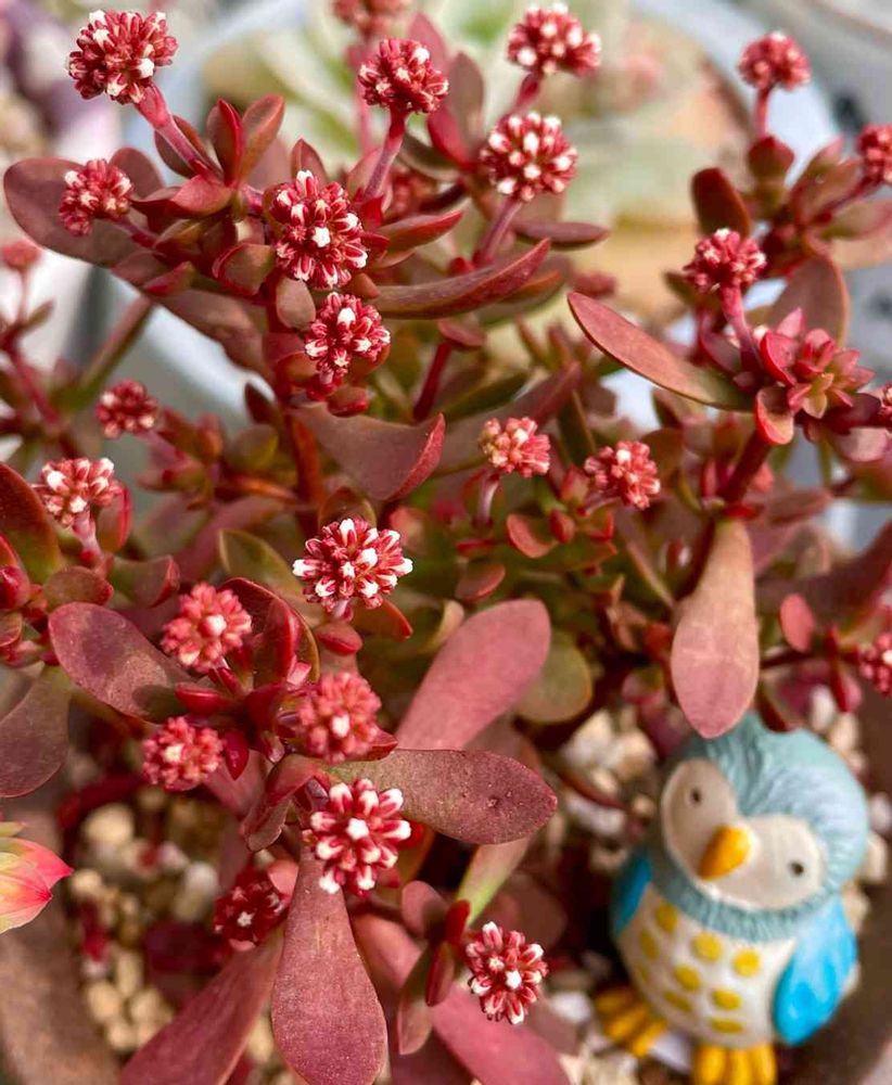 お気に入りの🦉ちゃん。今月は開花始めの紅稚児を眺めてます😘