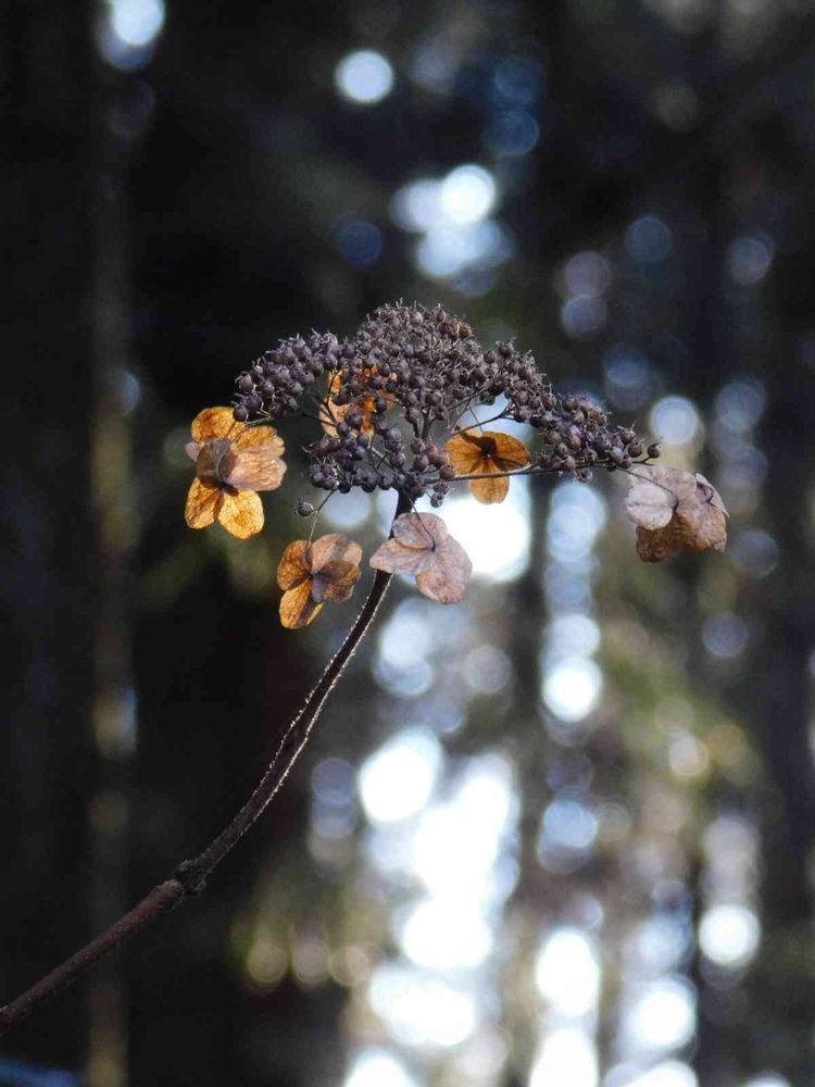 左濃く見える額花に杉林向こうから陽射しが少し差していたのです。