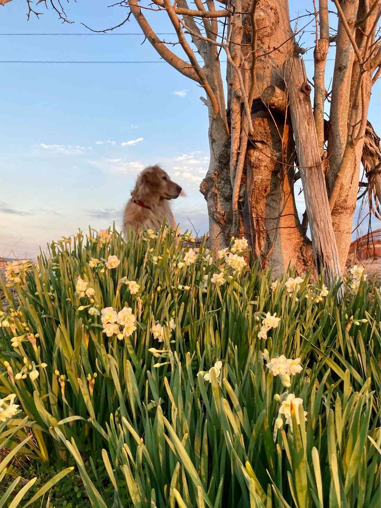 🐶『モクレンの木も八重咲き水仙も夕日で輝いているだワン』