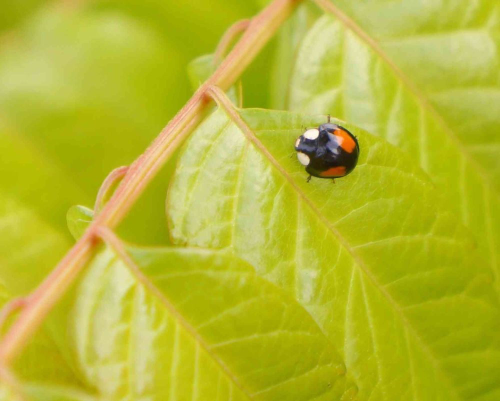 赤星テントウと淡い葉っぱの対比が綺麗✨