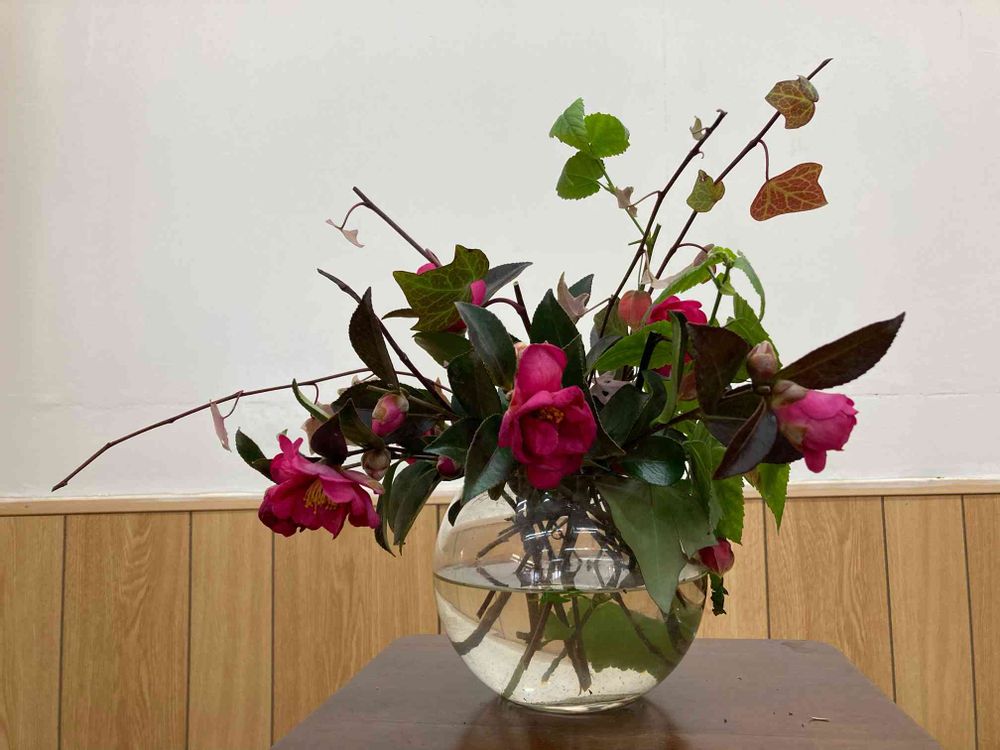 今日は道路にはみ出したたサザンカの剪定をし、勿体ないので、綺麗なところをアイビーと一緒に挿してみました❣️ところで、アイビーが紅葉したと喜んでいたのですが、寒さで弱っていると聞きました⁉️そうゆうこと❓