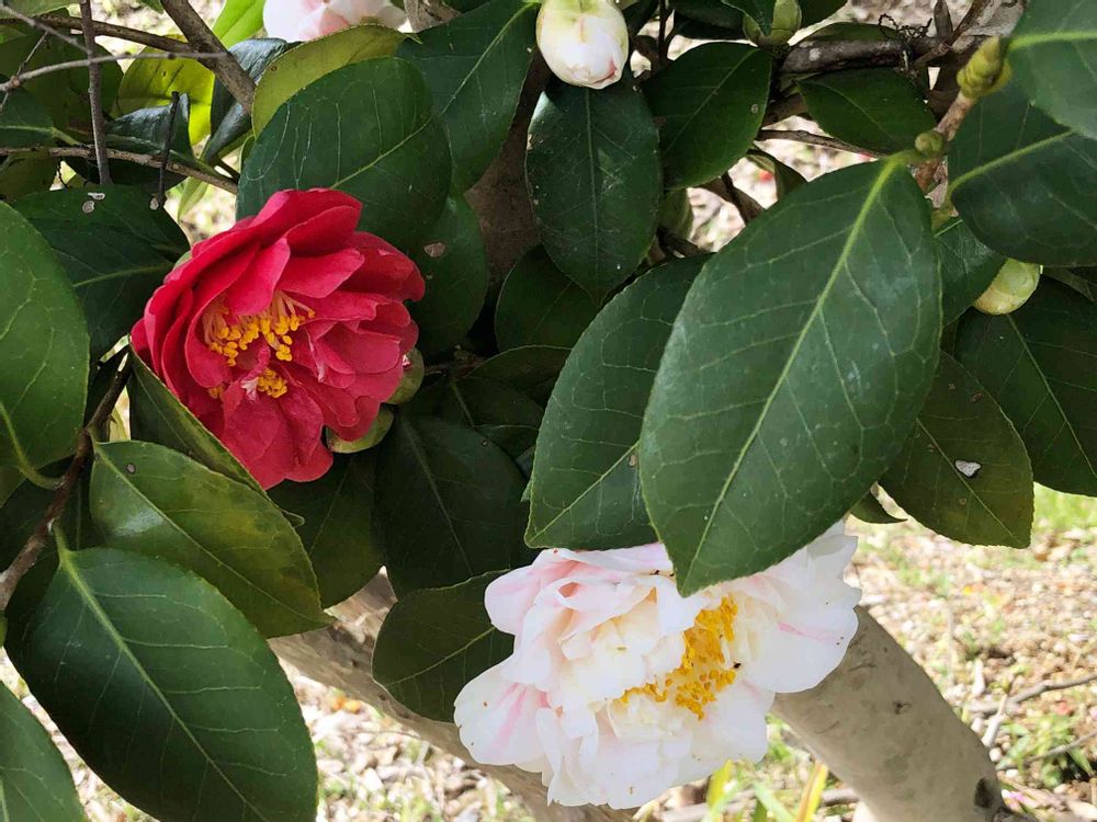 紅い椿のなかに白い椿が咲いていました🤭