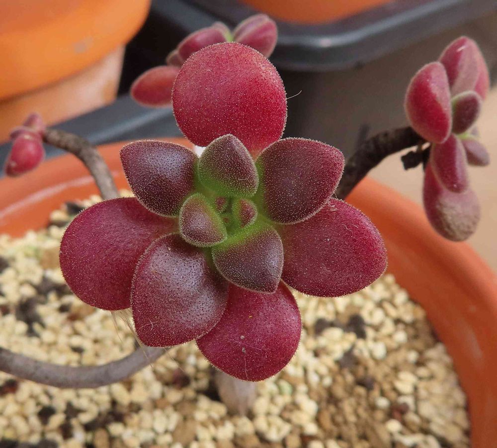 3度目の冬を迎えるアエオニウムのリンドレー。年々小ぶりになっていくけど,紅葉の色が濃くなってきた。今年の色は赤というより赤紫に見える。