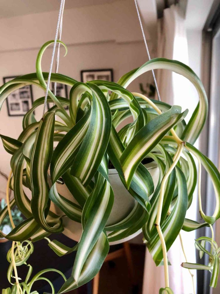 クセ毛のオリヅルランってあるんですね。うちのは直毛で、ツクツク真上に向かって生えて、伸びると下にフワッと下向きになりますね☺️